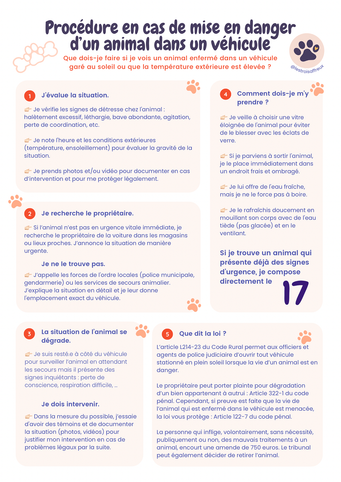Je vous propose une fiche pratique sur la procédure à suivre si jamais vous croisez le chemin d’un animal enfermé dans une voiture au soleil, qui constitue une grave mise en danger.