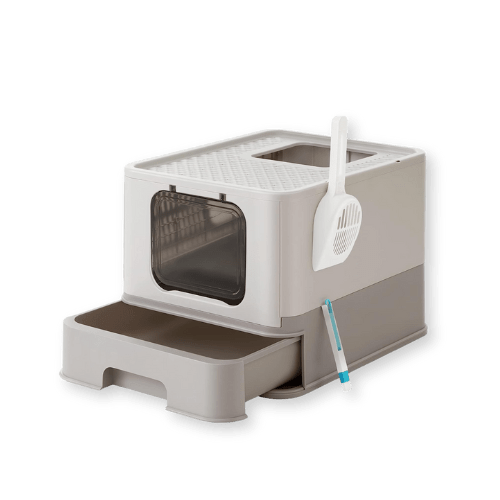 Un bon compromis peut être d’avoir un bac semi-ouvert. C’est à dire avec des bords hauts sur les côtés et à l’arrière, ce qui permet de répondre aux besoins du chat (observation, marquages) tout en étant pratique pour nous (évite les projections de substrat ou d’urine à l’extérieur).
